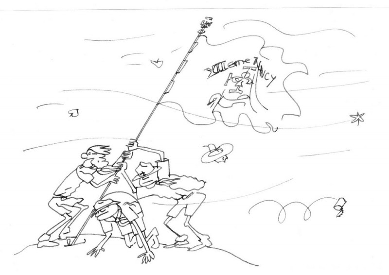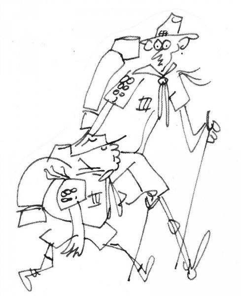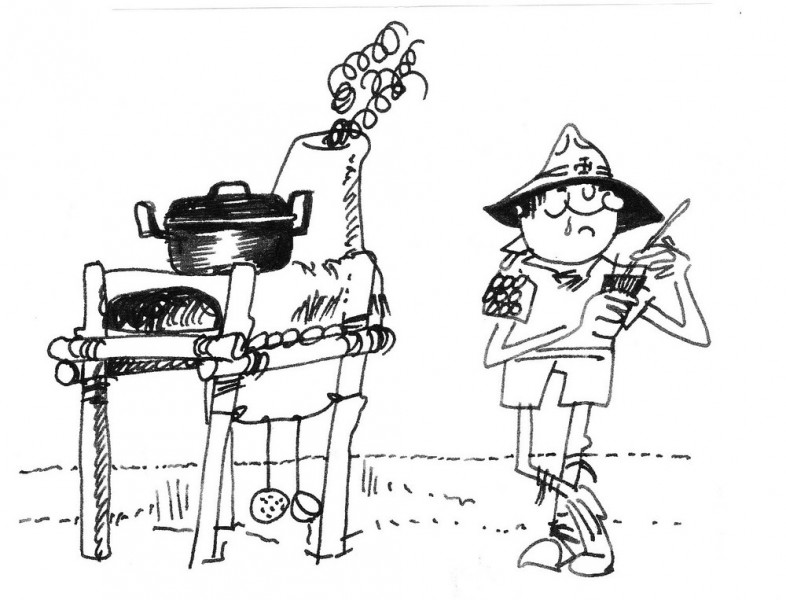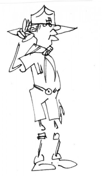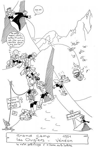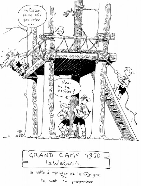 Ce scout de la 4ème NANCY SDF avait 14 ans en 1951. Ce garçon illustrait souvent de ses excellents dessins humoristiques les activités de la vie scoute de l'époque, grâce à un don, un coup de crayon exceptionnel. Nous avons pu nous procurer quelques unes de ses oeuvres que nous présentons ici. Son ancien Chef de Troupe Daniel Petit me disait récemment : "Et si tu voyais ses compte rendus d'explo, ses croquis panoramiques, ses croquis d'installations, de vrais chefs d'oeuvre". Y a t-il un rapport entre ce don, cet humour précoce à 14 ans, et le fait que Jean-Pierre a fait plus tard Polytechnique ...Pierre JOUBERT au même âge, faisait pareil à la troupe, mais cela le mena aux Arts déco ... !