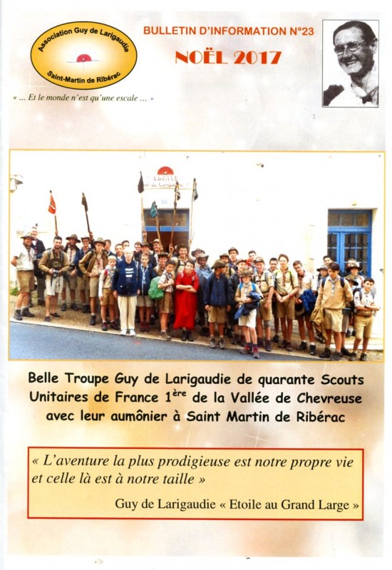 Février 2018 : Une association Guy de Larigaudie existe. Elle publie un bulletin d'information dont voici la couverture du dernier numéro, avec les informations pratiques.