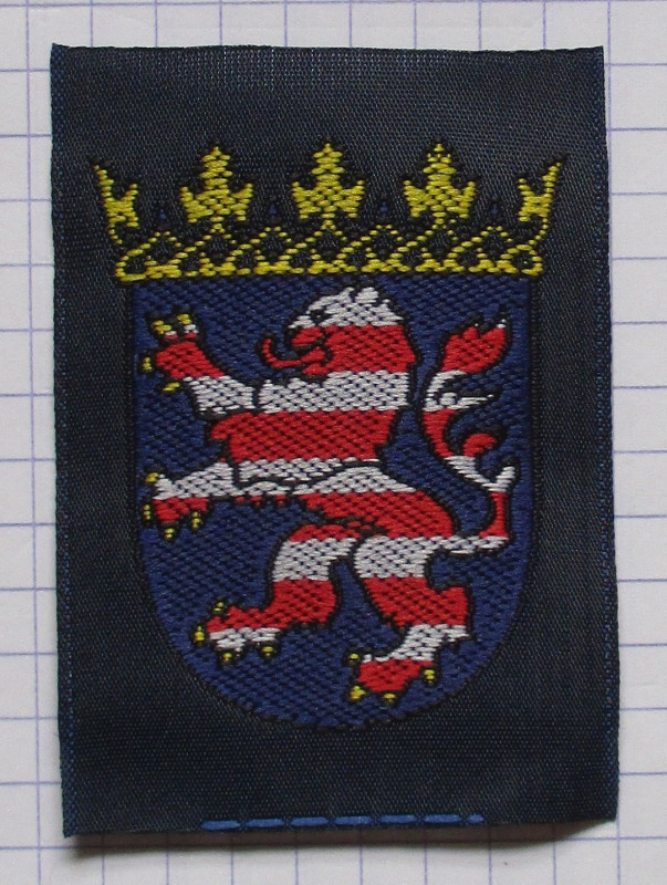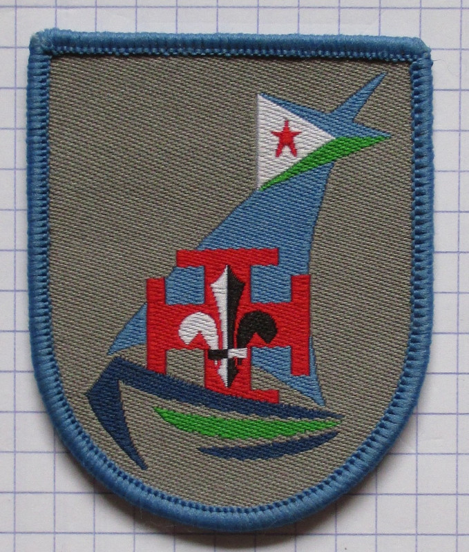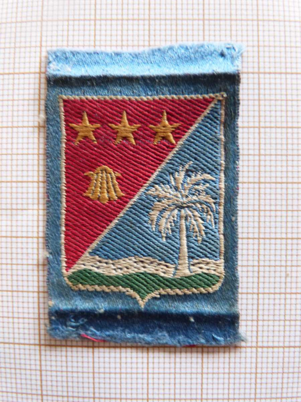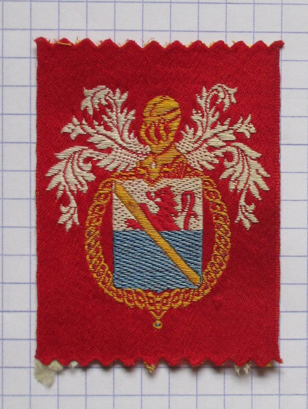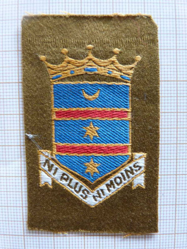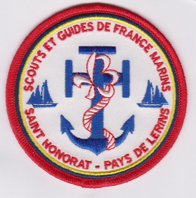 Sur un écu tricolore biaisé se sont les armes de la ville de Nice : aigle de gueules, sur trois coupeaux de Sinople, au bord d'une mer d'azur, le tout sur le fond d'argent, surmonté d'une couronne comtale d'or. Le pourtour cerné de gueules. Ce foulard historique m'a été remis par Mme Borfigua Marthe, nièce de l'Abbé Musso, aumonier de la 1ère Nice, où elle était cheftaine."