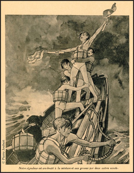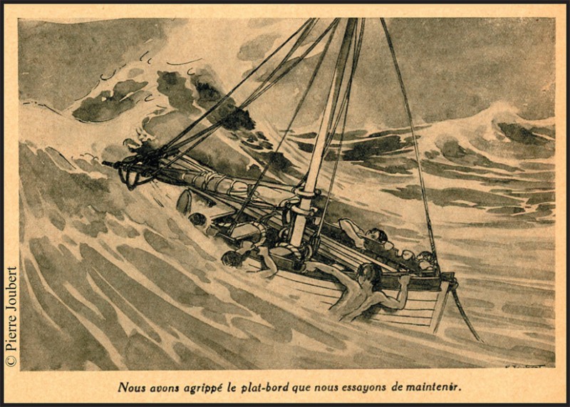 « Debout, vite, vite, debout. » Quelques coups de savate dans les côtes achèvent au besoin de dissiper la torpeur des scouts trop lents à distinguer la cause de ce réveil-surprise. En un instant, tous à l'eau jusqu'à la ceinture dans les lames qui déferlent, nous avons agrippé le plat-bord que nous essayons de maintenir. Nous étions heureusement — ou malheureusement — en caleçon de bain. Deux seulement ont en plus leur jersey.