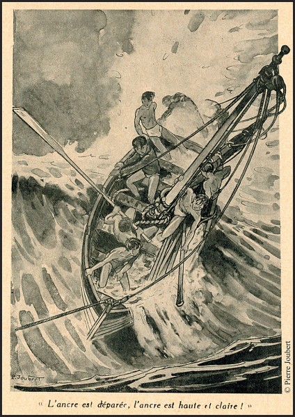 Ah ! Deux garçons ont réussi à sauter d'un seul coup à bord. Leurs avirons arc-boutés dans le sable maintiennent le bateau immobile une seconde. Et du même élan tout le reste de l'équipage a bondi à son poste. « Aux avirons tout le monde. A déraper le grappin. » Mais si le grappin n'a pas croche dans le fond, il persiste à labourer le sable sans vouloir venir Et le bateau doit effectuer en sens inverse tout le trajet de la dérive pour arriver à pic. Les lames brisent toujours dedans et l'eau monte sans cesse jusqu'à atteindre les bancs de nage.