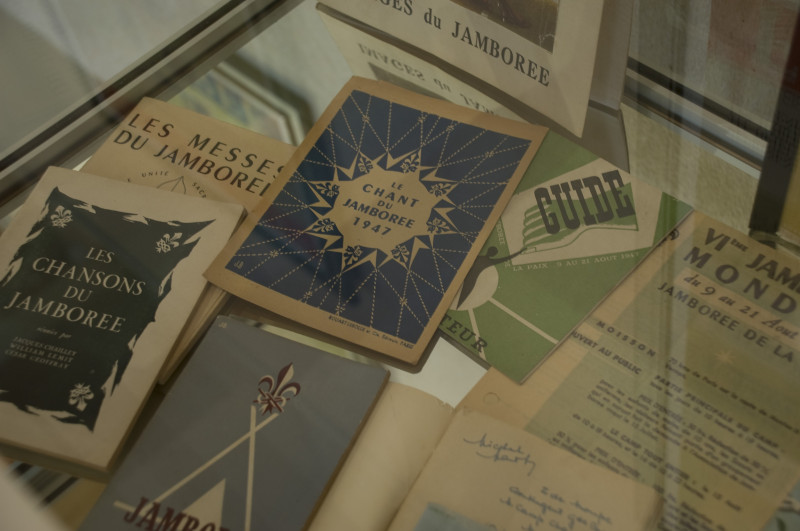 Les affiches et les cartes postales officielles sont présentées avec soin ainsi que quelques éditions et objets souvenirs. La collection des journaux Jamboree France figure également en bonne place dans une vitrine ainsi qu’un album photos donné par un chef de troupe ayant participé au Jamboree.
