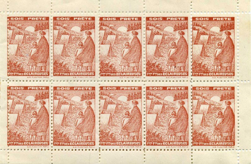 Pourquoi pas nous, pensent les filles de la Fédération Française des Eclaireuses (F.F.E.), et elles publient en 1930 à leur tour un carnet contenant un feuillet de 20 vignettes photographiques de propagande vertes sur le thème de la vie des Eclaireuses.